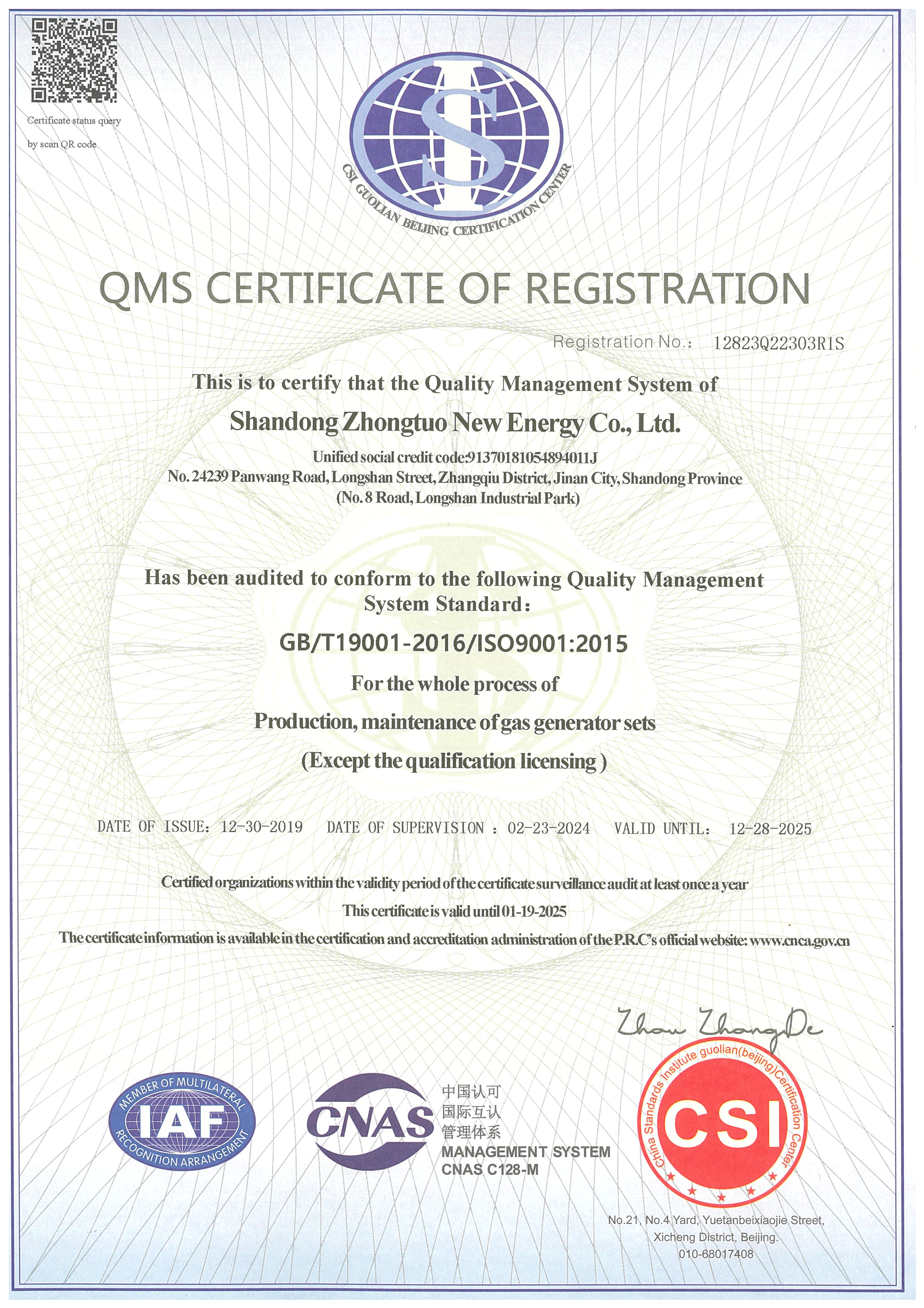 質量管理體系認證證書